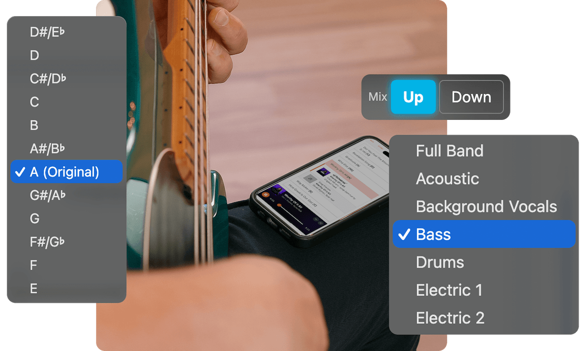 Listen to the full band mix, practice your instrument w/ Up & Down Mixes